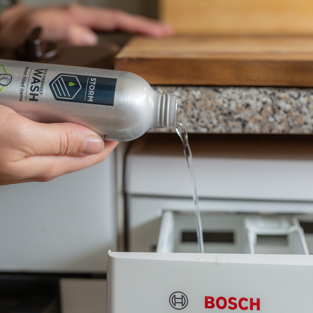 Pour 75ml of Storm wash into the detergent compartment & add 75ml of Storm Down Proofer into the conditioning compartment.