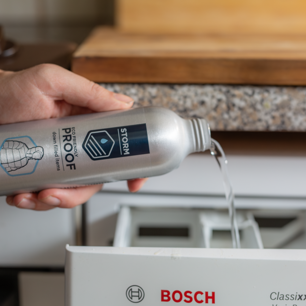 Pour 75ml of Storm Proofer into the conditioning compartment & if cleaning using Storm One Wash Cycle add 75ml of Storm Down Wash into the detergent compartment.
